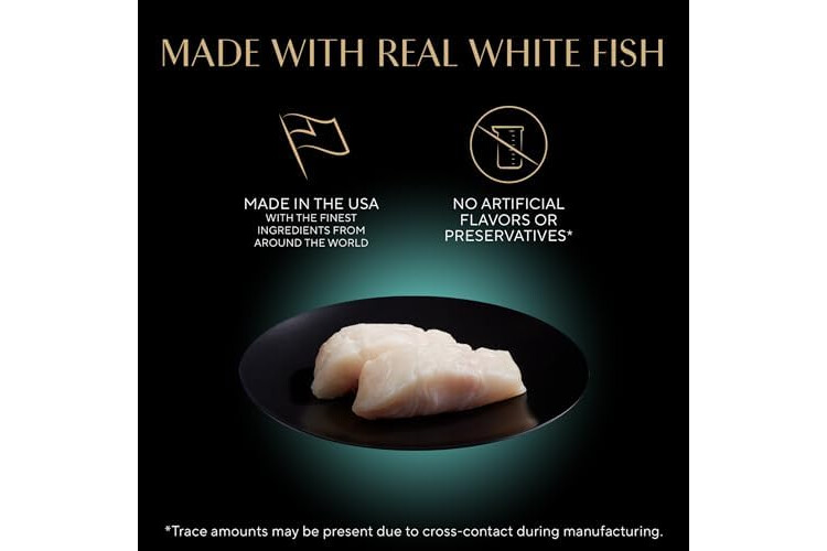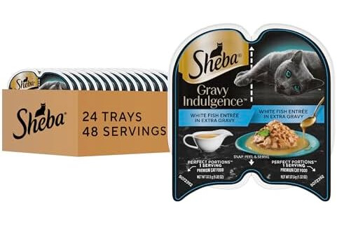 Appeal to your cat’s love of gravy with Sheba Gravy Indulgence White Fish Entree in Extra Gravy. With added moisture to keep your cat hydrated, this gourmet wet cat food is made with extra gravy when compared to Sheba Perfect Portions Cuts in Gravy. Made with real meat, this is perfect for picky eaters because they’ll enjoy the cuts of beef covered in a thick, delicious gravy for a protein-rich meal with irresistible flavors in a variety of textures. Easy-to-peel twin packs allow you to deliver your cat a gourmet serving every time without messy leftovers. Feel confident feeding your adult cat a complete and balanced meal for all life stages that is formulated without grains, corn, or soy and contains no by-products or fillers, and no artificial flavors, although trace amounts may be present due to cross-contact during manufacturing. Made in the USA with the finest ingredients from around the world, give your feline the nutrient-rich, wet cat food with extra gravy they want and deserve with Sheba Gravy Indulgence White Fish Entree In Extra Gravy.