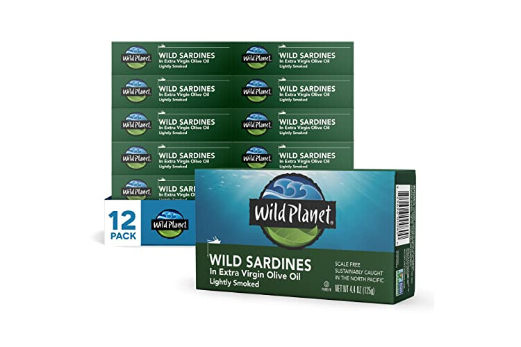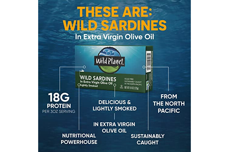 Wild Planet Wild Sardines in Extra Virgin Olive Oil, Lightly Smoked, Tinned Fish, Sustainably Wild-Caught, Non-GMO, Kosher, Gluten Free, 4.4. Ounce (Pack of 12)