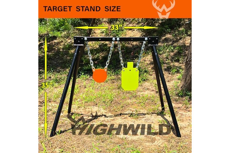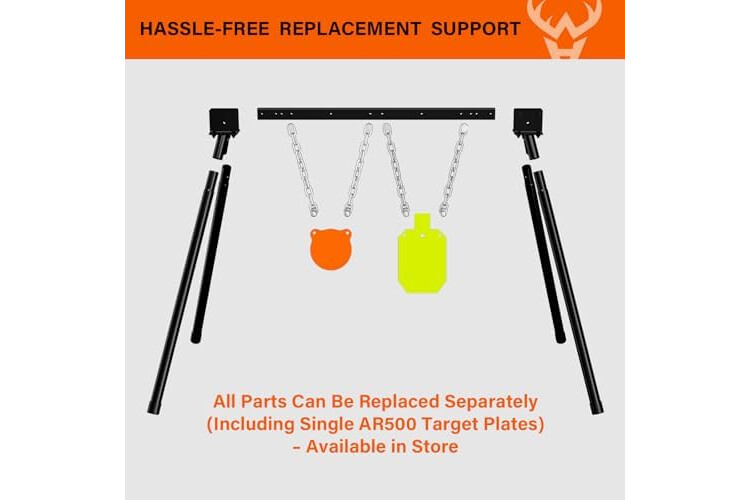Target Stand: Heavy duty steel construction with Rust-Proof powder coat finish, replacement parts readily available if any components wear out; Compactly designed steel target stand ensures easy transport and stability on uneven terrain