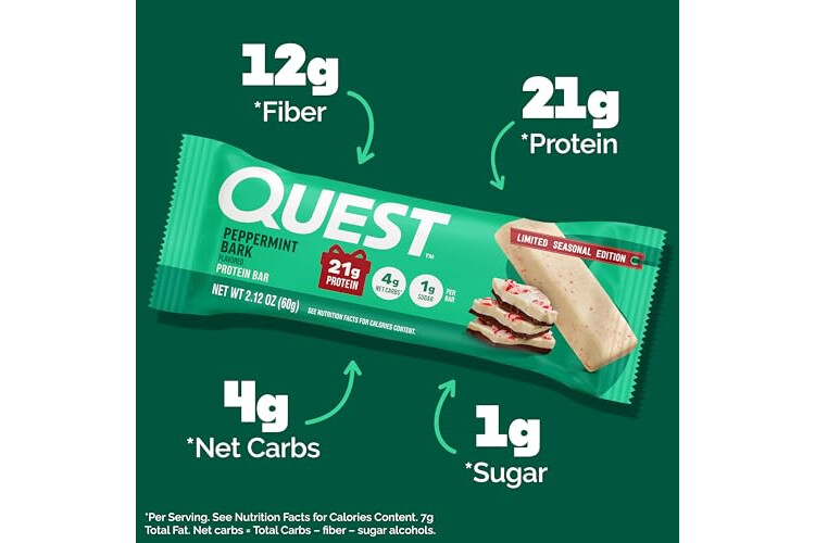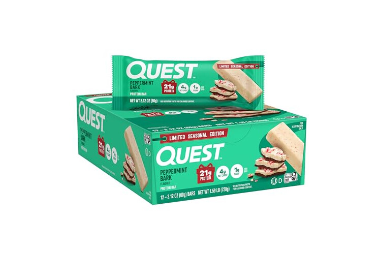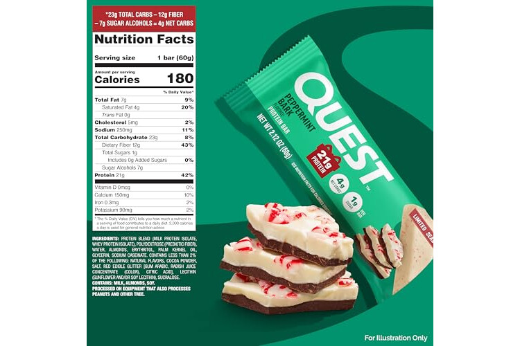 Quest Nutrition Peppermint Bark Protein Bar, 21g Protein, 4g Net Carb, 1g Sugar, Gluten Free, 12 Count