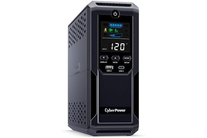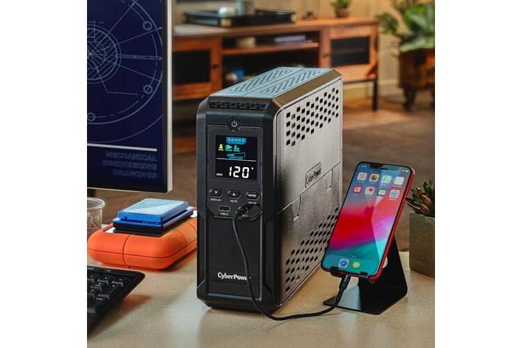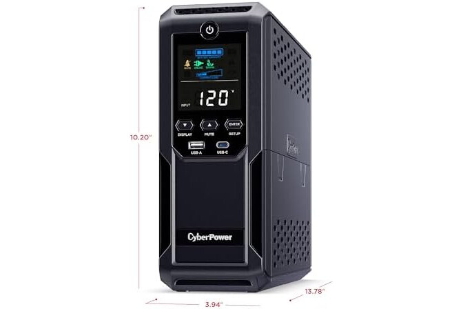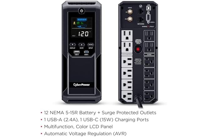 CyberPower CP1500AVRLCD3 Intelligent LCD UPS System, 1500VA/900W, 12 Outlets, 2 USB Ports, AVR, Mini Tower, Black