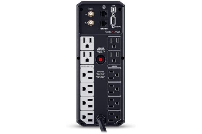 12 NEMA 5-15R OUTLETS: Six battery backup & surge protected outlets; six surge protected outlets; INPUT: NEMA 5-15P plug with 6-foot power cord; USB charge ports (1 Type-A, 1 Type-C) quickly charge mobile phones and tablets