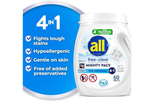 All Mighty Pacs Laundry Detergent, Free Clear for Sensitive Skin, Tub, 60 Count