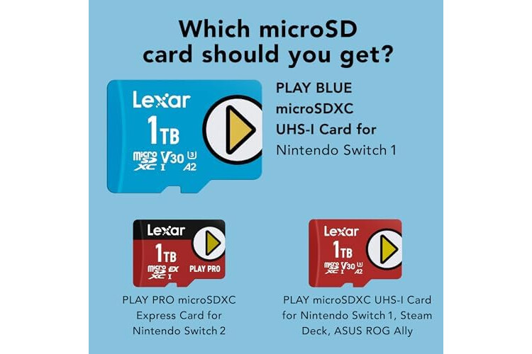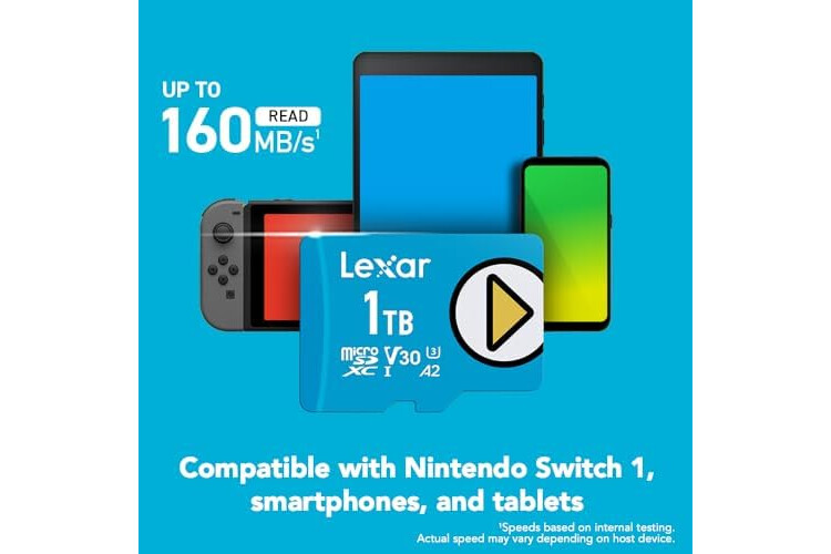 Lexar 1TB Play Blue Micro SD Card, UHS-I, C10, U3, V30, A2, 4K, Up to 160MB/s microSDXC Memory Card, Expanded Storage for Nintendo-Switch 1, Gaming Devices, Smartphones, Tablets (LMSPLBL001T-BNNNU)