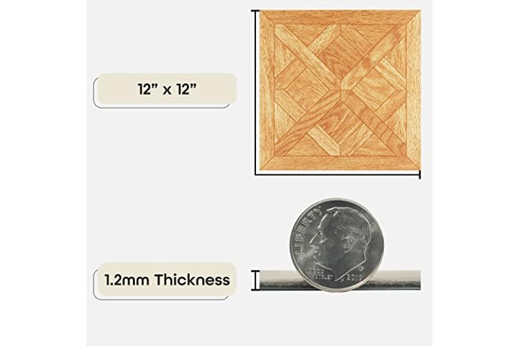 Dimensions: Each tile measures 12 inches x 12 inches and 1.2mm thick. There are 20 tiles per box, which will cover 20 square feet.