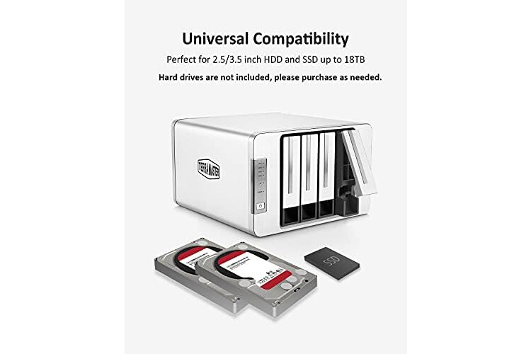 USB3.1 (Gen1, 5Gbps) Type-C interface, compatible with 3.5” SATA hard drive/2.5” SSD, supports up to 4 hard drives, total storage capacity up to 80TB (20TB x 4).