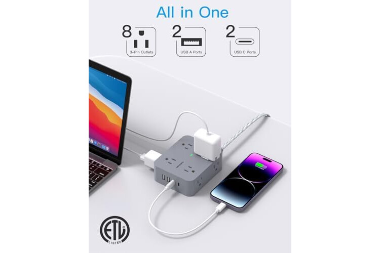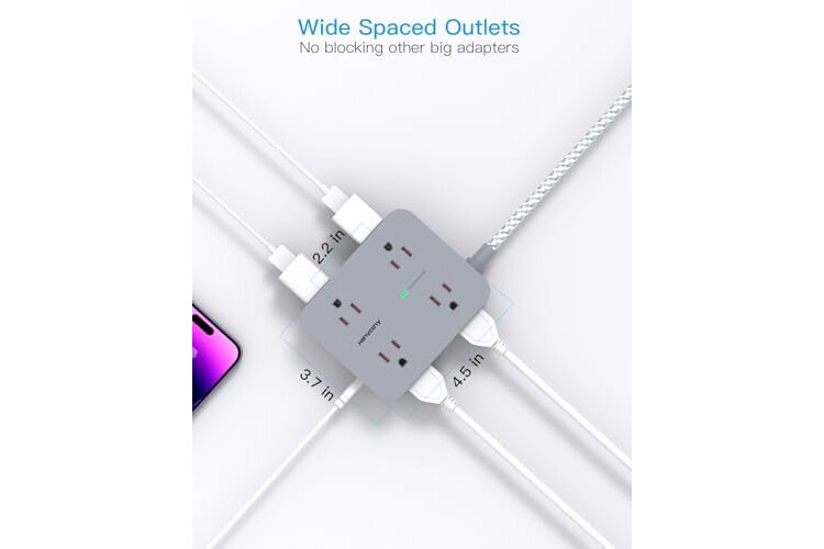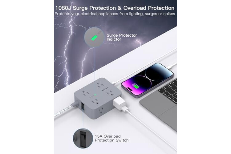 【12 IN 1 Power Strip with USB】- The 3-side 15 ft power strip surge protector with 8 AC widely outlets and 4 USB charging ports(Total 5V/3.1A) can power up to 12 devices simultaneously. It could charge your cellphone, laptop, tablet, cameras without a variety of converters, save your space and make your desktop organize, perfect suitable for your desktop or nightstand home, office, travel, college dorm room
