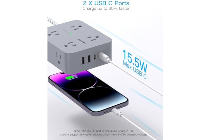 【2 x USB C Power Strip】- Added extra 2 USB C ports for your devices, the USB C port can charge up to 5V/3A. USB-A ports can charge up to 5V/2.4A Max, all USB Ports Output is 5V/3.1A, ...