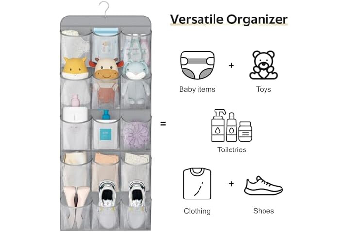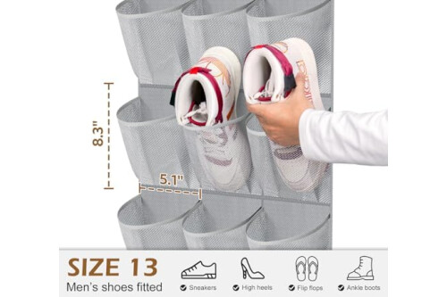 【Large and sturdy mesh pockets】This closet shoe organizer work great for ladies size 8.5-9 shoes, a size 13 men's shoes, roomy enough to put two sandals or slippers in each pocket,also suit for bra, socks, underwears, folded clothes, jeggings, scarves;