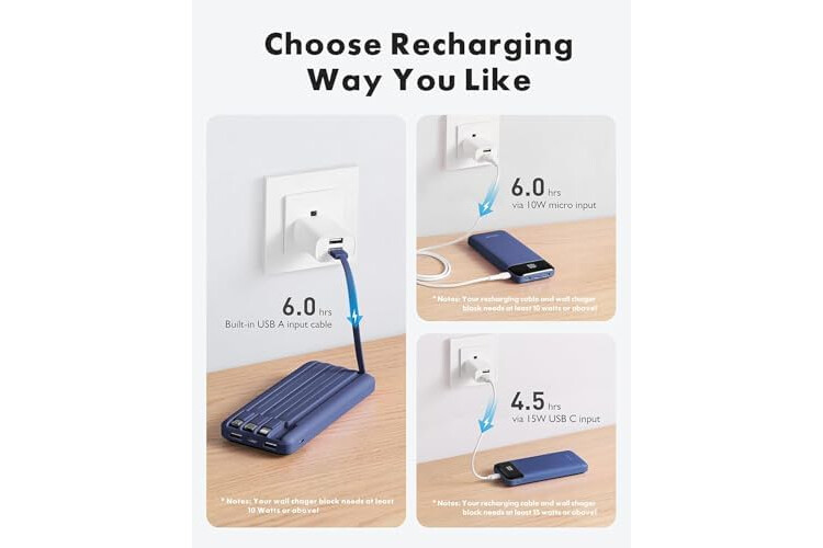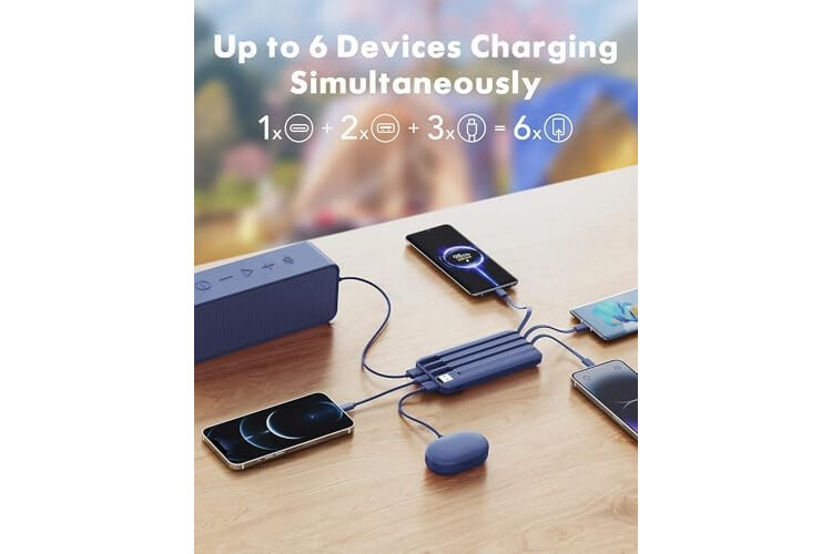🔋【6 Outputs and 3 Inputs】Portable charger has 6 outputs and 3 inputs, you may charge 6 devices max at the same time, recharge battery pack with 3 options easily. Portable charger builts in 3 output cables and another 3 outputs (Total 6 outputs), great for multi electronics users who has iPhone, android or micro devices. It also builts in 3 inputs (1 built-in recharging cord/cable, 1 usb c input, 1 micro input), which you can use any one of them to recharge battery pack conveniently.