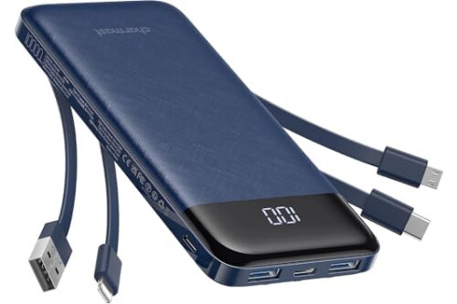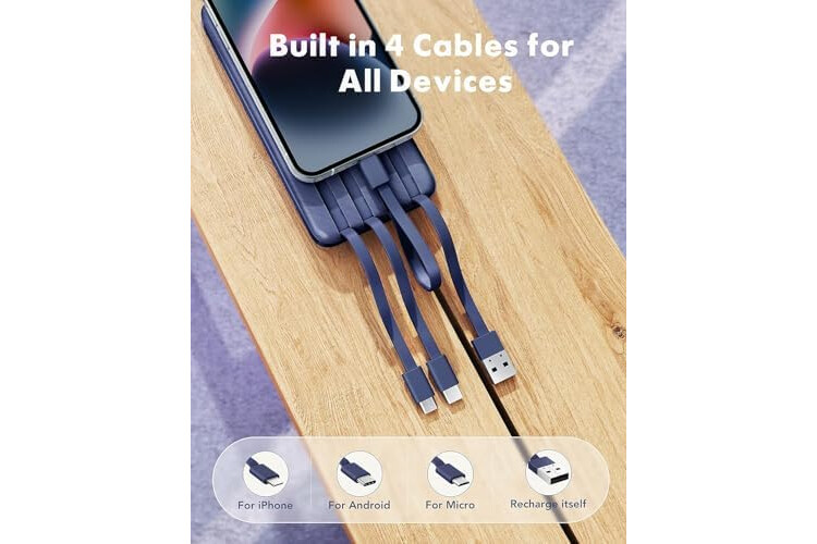 🔋【Portable charger with built in cables】Slim portable charger built-in 4 cables included 3 output cables and 1 input cable. Total 3 output cables can charge almost for all types port devices. Such as for iPhone, iPad, for Samsung, for other USB C port phones, tablets, and also for Micro devices. All in one portable charger, you would not need to carry various cables or adapter any more!!!