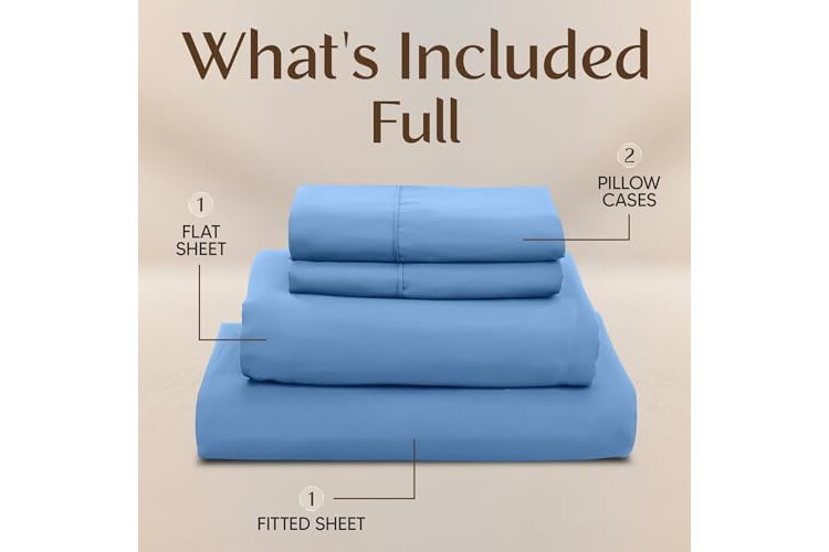 Full Sheet Set – 4-piece soft sheets full size includes flat sheet (81" x 96"), fitted sheet (54" x 75") with 15" deep pocket and 2 pillowcases (20" x 30"). Soft, cooling, and durable full size sheets set. Ideal sheets for full size bed set