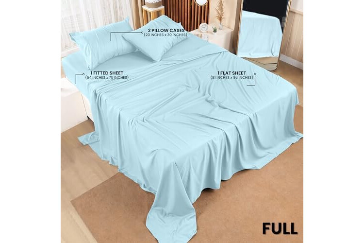 Full Sheet Set – 4-piece soft sheets full size includes flat sheet (81" x 96"), fitted sheet (54" x 75") with 15" deep pocket and 2 pillowcases (20" x 30"). Soft, cooling, and durable full size sheets set. Ideal sheets for full size bed set