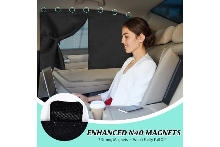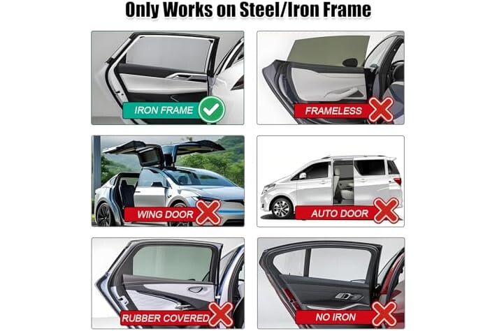 Magnetic Design with 7 Strong Magnets: Our car window shade for baby features 7 upgraded magnets at the top for a secure fit on steel frames. The powerful magnets ensure stability and prevent it from falling off easily. Please check your window frame before purchasing, as magnets may not work well with plastic or rubber frames. Not for frameless windows like Tesla's.