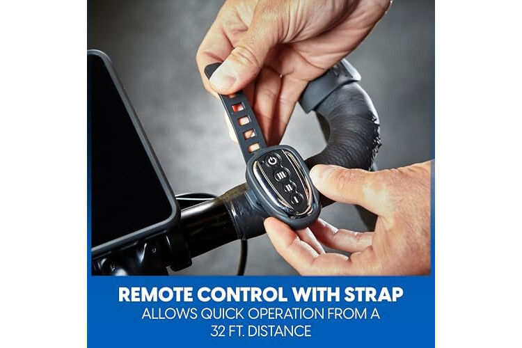 [REMOTE CONTROL WITH STRAP] – Operate the air mover from a distance. Strap the remote to your bike or treadmill to adjust the speed without disrupting your workout. 32' effective remote-control distance. Remote + batteries included.