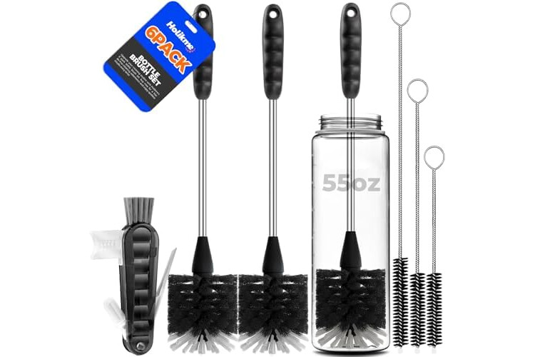 Holikme 6 Pack Bottle Brush Set, 14" Long Handle Stainless Steel Bottle Cleaner Brush, 3 Straw Brushes, 3-in-1 Bottle Cleaning Brush for Water Bottle, Antistatic Lab Brushes, Straws Black