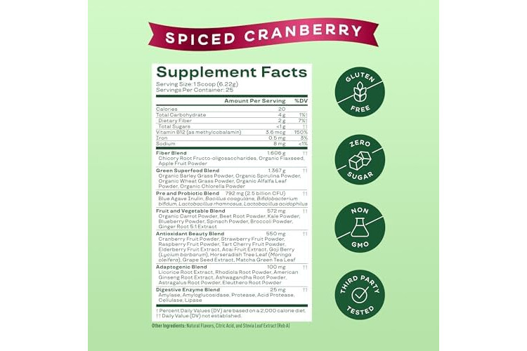 Bloom Nutrition Superfood Greens Powder, Digestive Enzymes with Probiotics and Prebiotics, Gut Health, Bloating Relief for Women, Chlorella, Green Juice Mix with Beet Root, 25 SVG, Spiced Cranberry