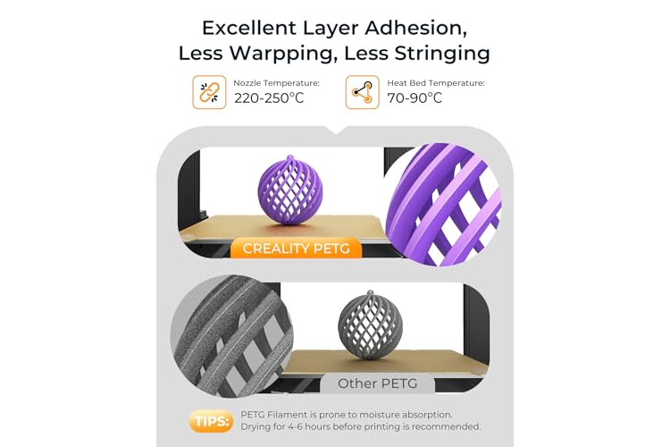 【Toughness-enhanced PETG】 Creality PETG choose durable and strong material that delivers excellent clarity, light transmission, and a glossy finish. It is recommended to use a printing temperature of 220-250°C and a base plate temperature of 70-80°C for better printing results.