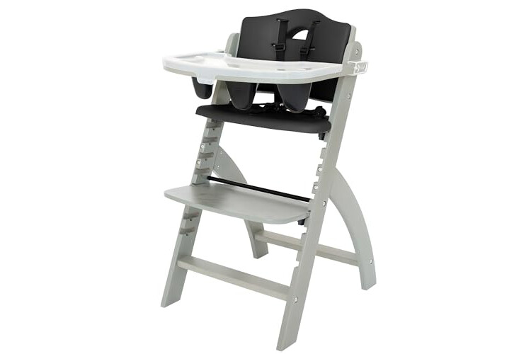 Abiie Beyond Junior Wooden High Chair for Babies and Toddlers - Convertible 3-in-1 Baby Highchair with Removable Tray - 6 Months to 250 Lb - Water Resistant - Misty Grey Wood with Black Pearl Cushion