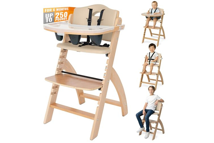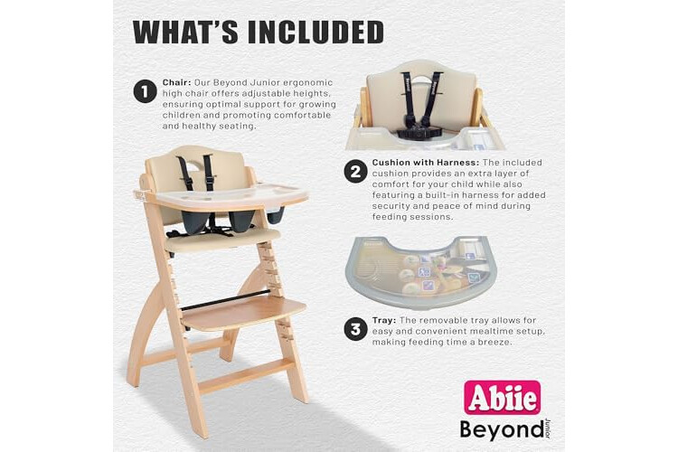 Abiie Beyond Junior Wooden High Chair with Tray - Adjustable and Convertible High Chair for Babies and Toddlers - 6 Months to 250 Lb - Water Resistant - Natural Wood with Beige Cushion