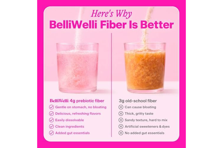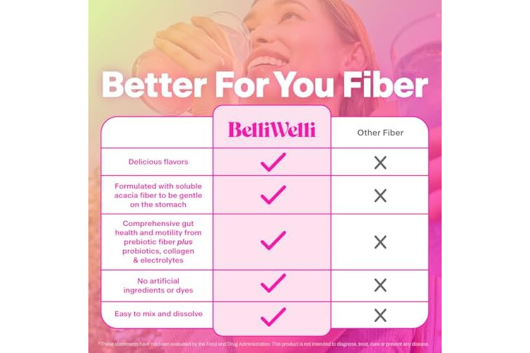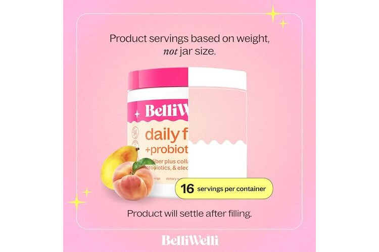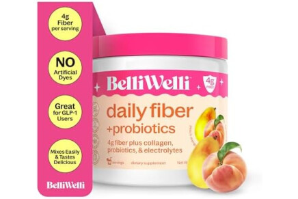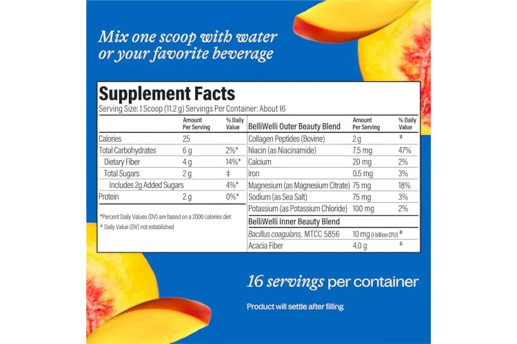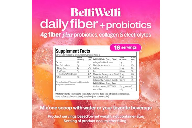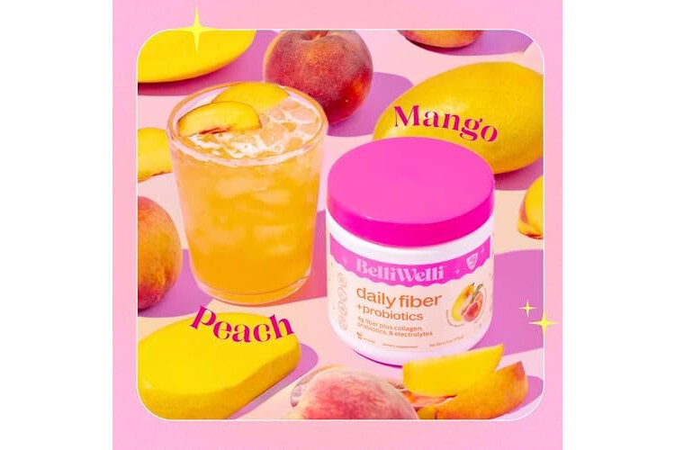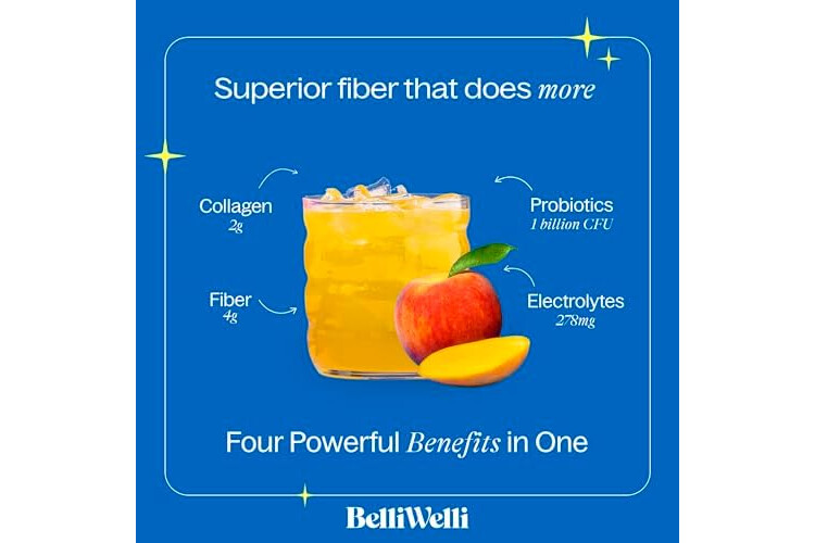 BelliWelli Fiber Supplement for Women & Men – Premium Daily Fiber Powder from Organic Acacia with Added Collagen, Electrolytes & Probiotics – No Bloat, Constipation & Gut Health Support (Peach Mango)
