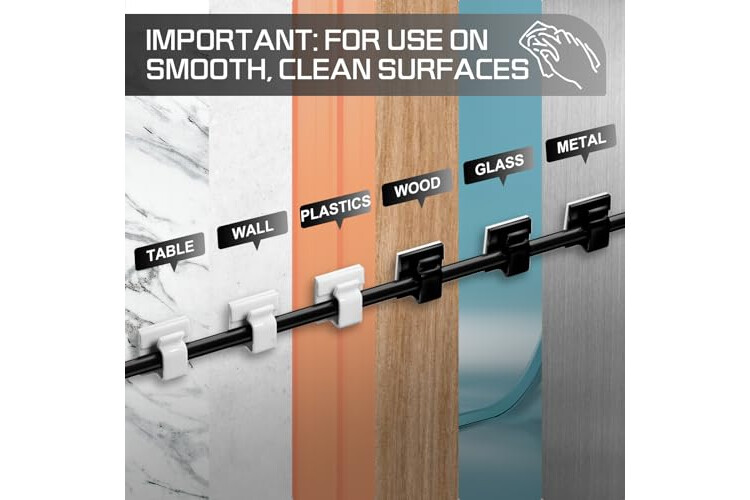 • Easy to Use: Just peel off the protective film and stick the wire clips for electrical wires on a flat and dry surface without screws or tools, our wire holder clips will organise your clutter wires neatly and tidily. These finisher wire clamp cable clips also work well on table, metal, walls, plastics, glass, wood surface.