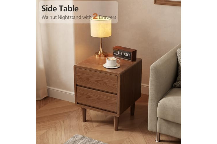 Solid Wood Nightstand, Walnut Nightstand with Drawers Mid Century Modern Night Stand,Wood Night Stands,Small Bedside Table for Bedroom, Dorm and Living Room, Walnut Bedside Table