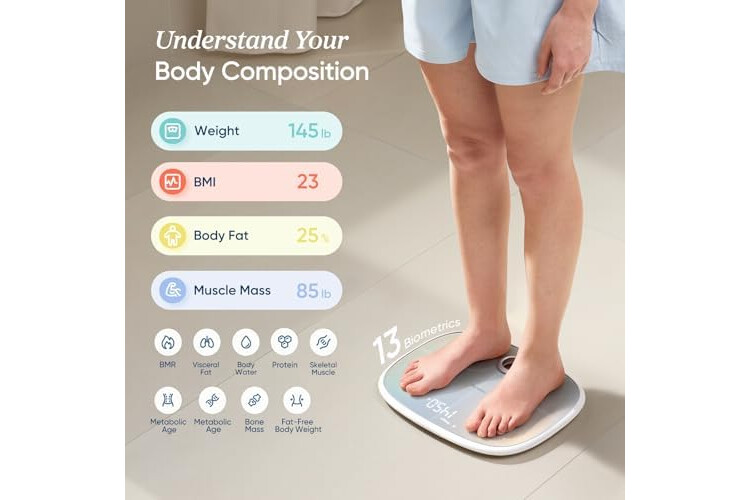 Etekcity Smart Rechargeable Scale for Body Weight, BMI, Fat, Muscle Mass, FSA&HSA Eligible, Digital Bathroom Scale with 13 Metrics, Secret Mode, Bluetooth Connect to Free Apps, Rainbow White
