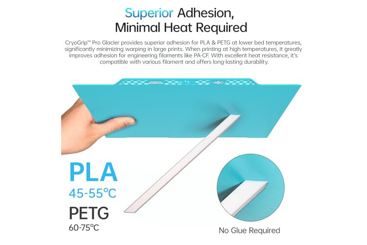 Hollow Out Handle Design: CryoGrip Pro Glacier Build Plate only heats up slightly in the hot bed at 100℃, protecting both hands. After printing is completed, the build plate can be immediately removed and replaced with a new one to continue printing, without waiting for the build plate to cool down bef...