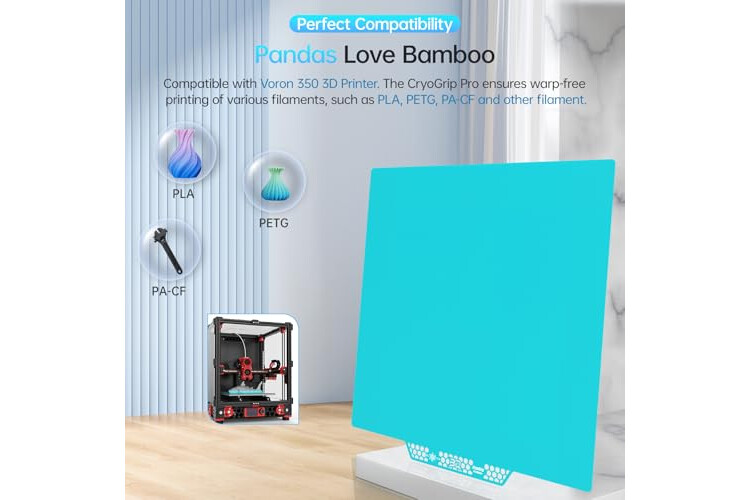 Perfect Compatibility: CryoGrip Pro Glacier Build Plate is suitable for 3D printers with a platform size of 356x356mm, for Voron 350 3D Printer. Compatible with PLA, PETG, ABS, PA and other filament. (NOTE: Glacier printing adhesion not as good as Frostbite with PLA and PETG)