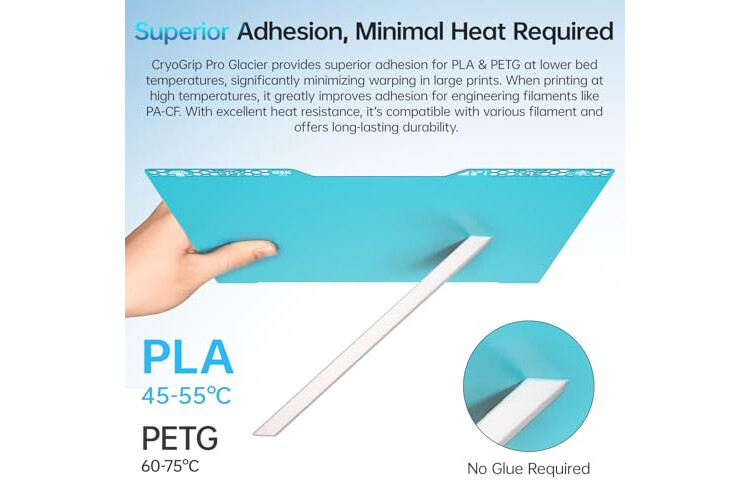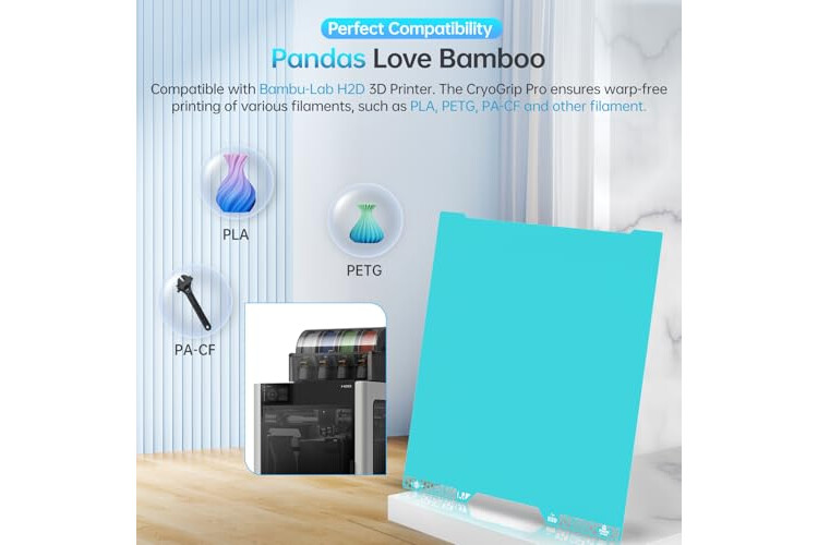Perfect Compatibility: CryoGrip Pro Glacier Build Plate is suitable for 3D printers with a platform size of 355x346mm, for Bambu-Lab H2D/H2S 3D Printer. Compatible with PLA(45-55℃), PETG(60-75℃), ABS, PA and other filament. (NOTE: Glacier printing adhesion not as good as Frostbite with PLA and PETG)