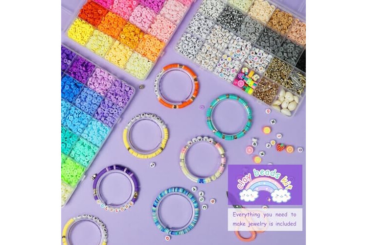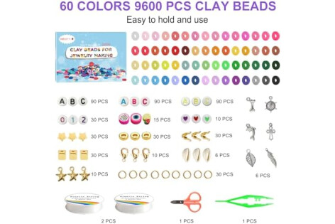 PERFECT BRACELET MAKING KIT - all you need included, 3 boxes 9600pcs clay beads and 500pcs charms kit (include letter beads, colorful heart beads, colorful number beads, fruit beads, golden beads, spacer beads, charms, etc. more than 20 types of accessories) 2 rolls stretchy strings, 1 scissors, 1 tweezers. this complete, expansive jewelry making kit is filled with endless possibilities to be imaginative, to meet all your needs for bracelet & jewelry making
