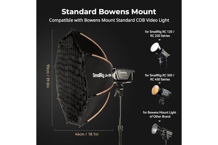 Standard Bowens Mount - With the standard Bowens mount, this softbox can attach to the Bowens Mount COB Lights for SmallRig RC 120D/ 120B/ 220D/ 220B/ 350D/ 350B/ 450D/ 450B, and for Neewer for Aputure for Godox Bowens mount light.