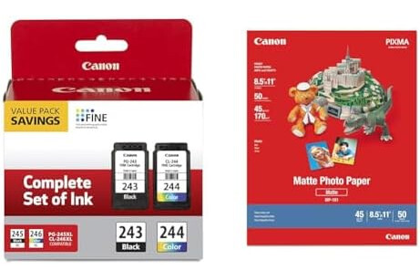 Canon Ink and Photo Paper Bundle - PG-243/ CL-244 Ink Multi pack for TR4520, MX492, MG2520, MG2922, TS302 and TS202 Printers + Canon 7981A004 Photo Paper Plus Matte 8-1/2 x 11 50 Sheets