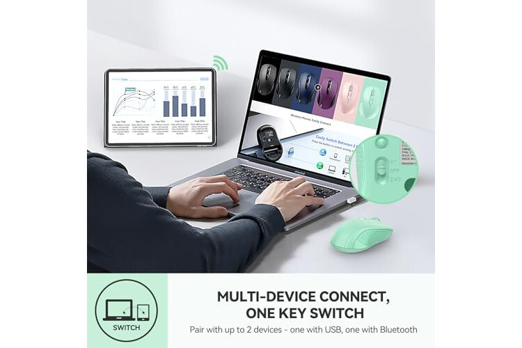 Multi-Mode Connectivity: wireless mouse switches between 2 devices via BT5.0/BT3.0/2.4GHz. Compatible with laptops/tablets/MacBooks, realizes free switches between 2 devices(with Bluetooth mode and 2.4G mode) in a switch button on the computer mouse wireless.
