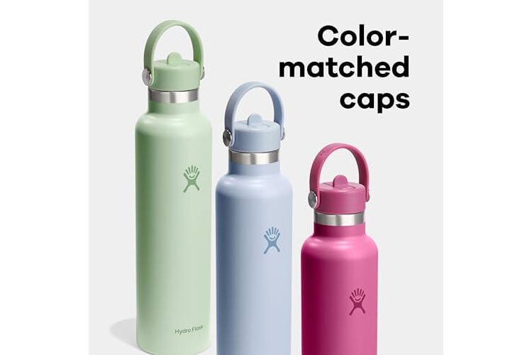 25 OZ COCONUT CREAM STRAW BOTTLE: A 24 oz Standard Mouth water bottle with small drinking spout with Hydro Flask's leakproof Flex Straw Cap—easy to fill, easy to drink. Open it up, add your ice, and flip to sip. The insulated stainless steel keeps it cold for up to 24 hours.