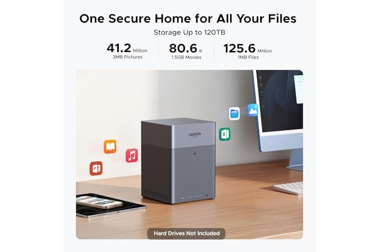 120TB Massive Capacity Embraces Your Overwhelming Data: The NAS offers enough room for your digital life, no more deleting, just preserving. You can store 41.2 million pictures, or 4 million songs, or 80.6K movies or 125.6 million files! It also does automatic backups and connects to multiple devices regardless of the OS, IOS, Android and OSX. *Storage disks not included.