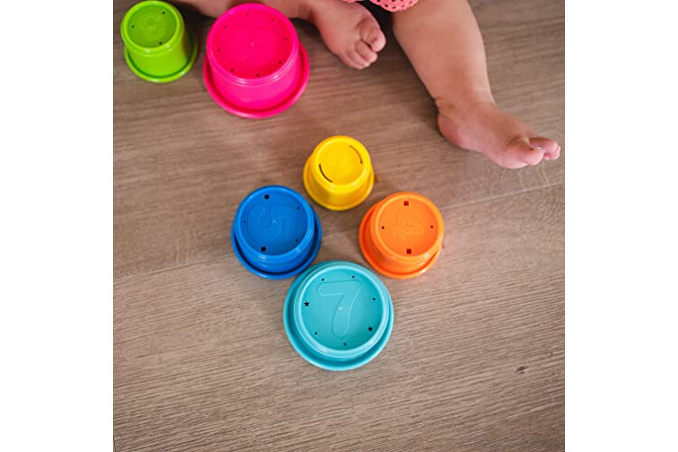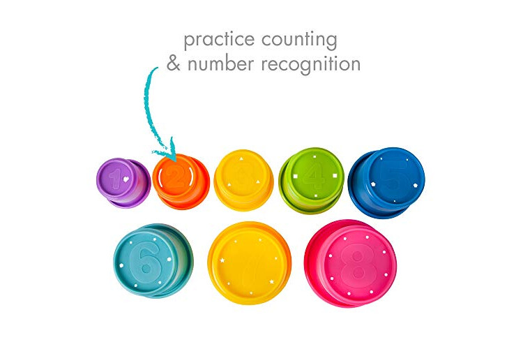 Baby Development Toys: Each of these stacking cups doubles as baby learning toys by featuring features large numbers on the bottom to help toddlers practice counting