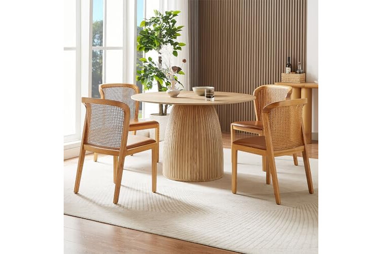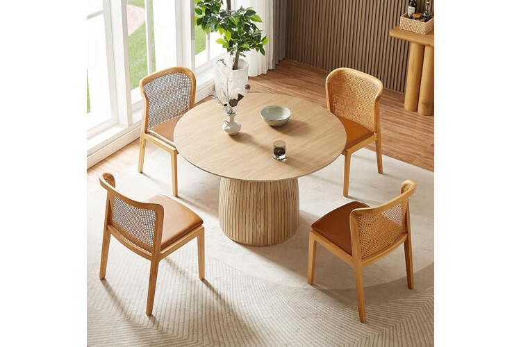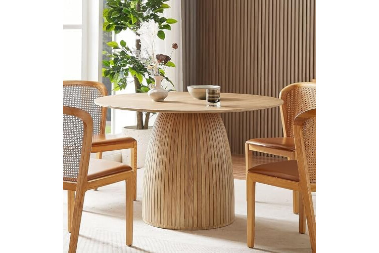 47" Round Dining Table for 4-6 People, Modern Farmhouse Wood Dining Room Table with Circle MDF Table Top & Fluted Circular Pedestal Base for Kitchen, Restaurant, Café, Oak
