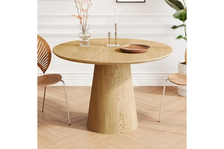 Farmhouse Round Dining Table for 4-5, 43" Wooden Round Kitchen Table with MDF Table Top Pedestal Base,Mid Century Modern Minimalist Dining Table for Dining Room Kitchen,Living Room, Small Space Oak