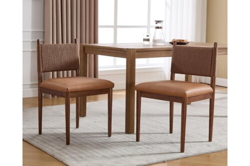 EALSON Mid Century Modern Dining Chairs Set of 2 Walnut Wooden Dining Room Chairs with Woven Back Comfortable Leather Upholstered Kitchen Chairs Armless Side Chairs for Kitchen, Brown