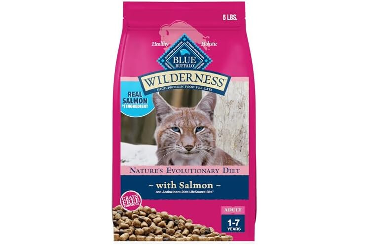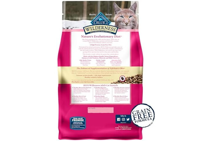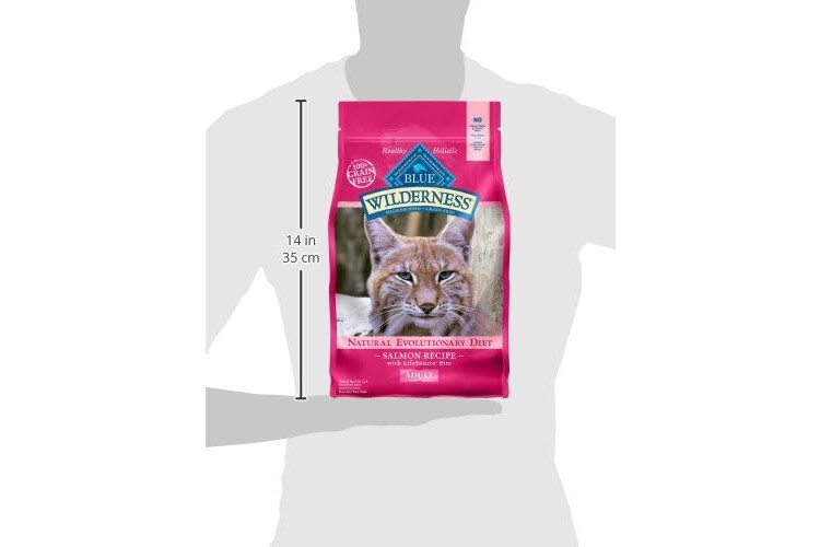 BLUE Wilderness Natural Cat Food is a great choice for Pet Parents looking to satisfy their cat's natural cravings. This protein-rich dry cat food for adult cats is PACKED WITH REAL SALMON to help build strong muscles, plus natural sources of fiber to help provide optimal nutrient absorption and digestive health. What's more, this grain-free cat food features an optimal balance of Omega 3 and 6 fatty acids to help promote a shiny coat and healthy skin. Like all Blue Buffalo cat food, BLUE Wilderness natural cat food contains no chicken (or poultry) by-product meals. It's also free of corn, wheat, soy, artificial flavors, and preservatives.