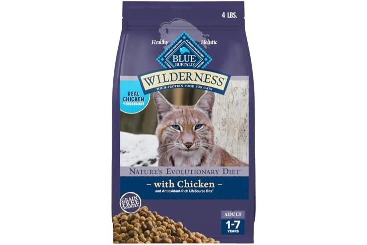 Contains: One (1) 4-lb bag of BLUE High-Protein and Grain-Free Wilderness Natural Adult Dry Cat Food, Chicken Recipe
