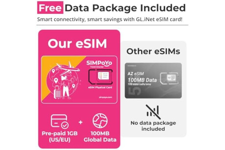 Physical eSIM Card For GL.iNet Router Only - Travel eSIM With Global 4G / 5G Networks, Free 1GB For US/EU+100MB Global Data, Physical Activation, Tethering, Data Only, Perfect For International Travel