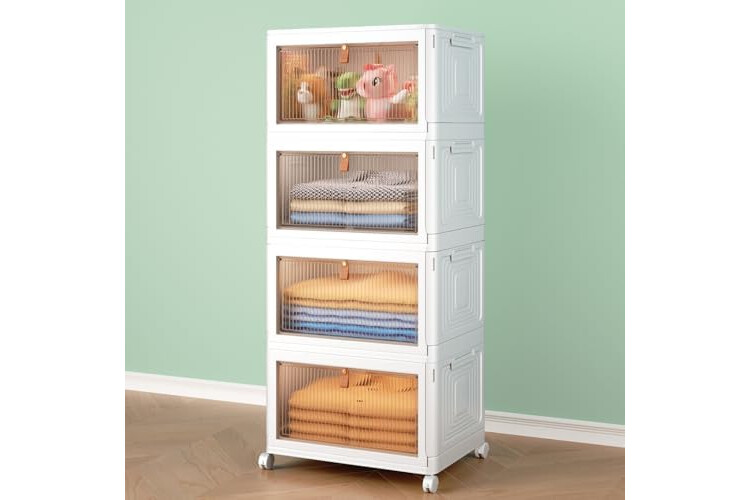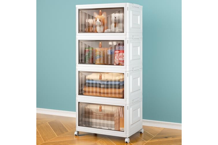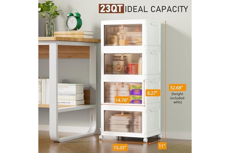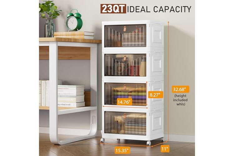 4 Tier Storage Bins with Lids, 23QT Stackable Closet Organizers and Storage with Wheels, Collapsible Storage Boxes, Foldable Plastic Storage Containers for Home,Office, Dorm Room-White