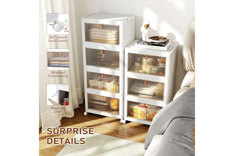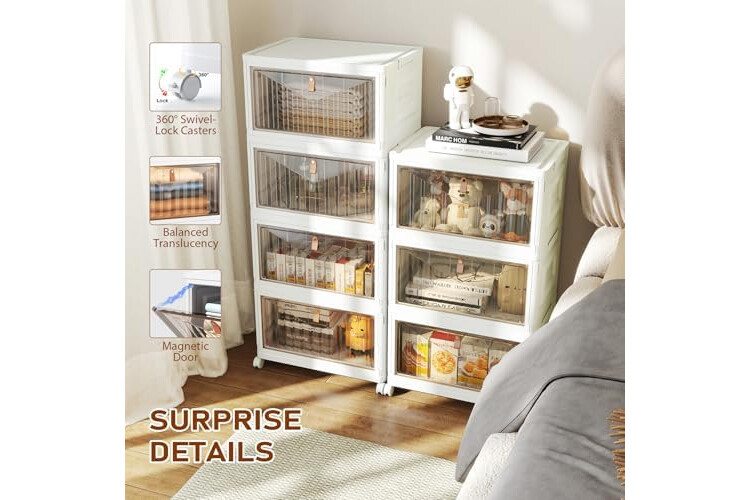 Stackable & Removable - The storage organizer bins are stackable and mobility. Each layer has matching grooves and clasps on both sides of the top to securely lock the clear storage bins. There are four rotating wheels at the bottom, which makes it easy for you to move. In addition, 2 wheels of the storage shelves have clasps that hold the locker in place to prevent it from...