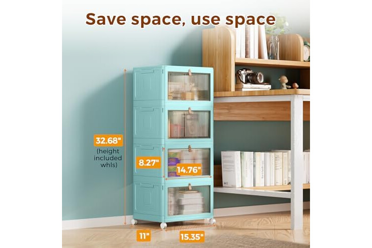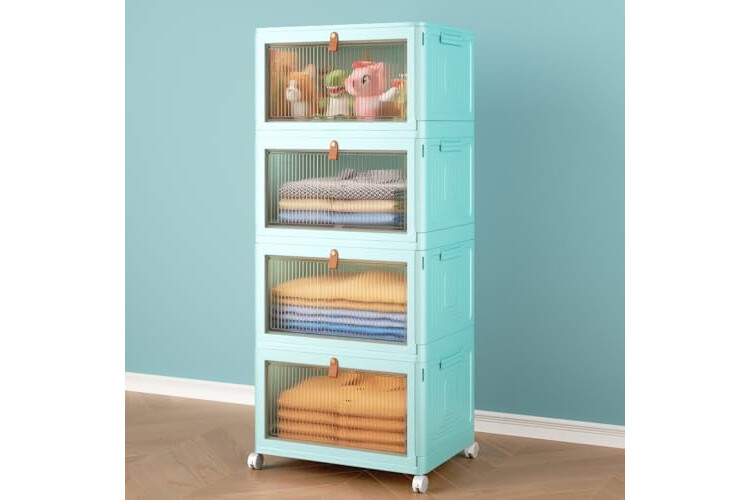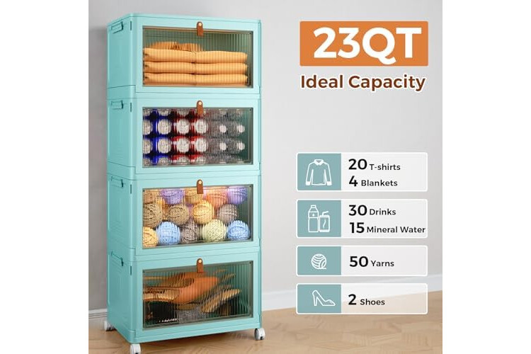 4 Tier Stackable Plastic Storage Bins with Lid and Wheels - 23 QT Closet Organizers and Storage, Foldable Storage Containers, Organization and Storage Boxes for Craft, Home, Pantry, Dorm, Green