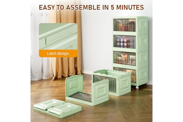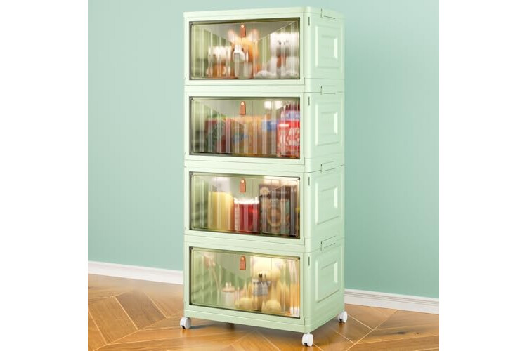 4 Tier Stackable Plastic Storage Bins with Lid and Wheels - 23 QT Storage, Foldable Storage Containers, Organization and Storage Boxes for Craft, Home, Pantry, Dorm, Green