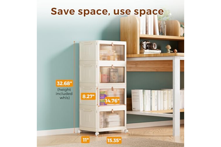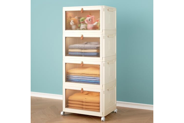 Stackable & Removable - The storage organizer bins are stackable and mobility. Each layer has matching grooves and clasps on both sides of the top to securely lock the clear storage bins. There are four rotating wheels at the bottom, which makes it easy for you to move. In addition, 2 wheels of the storage shelves have clasps that hold the locker in place to prevent it from...