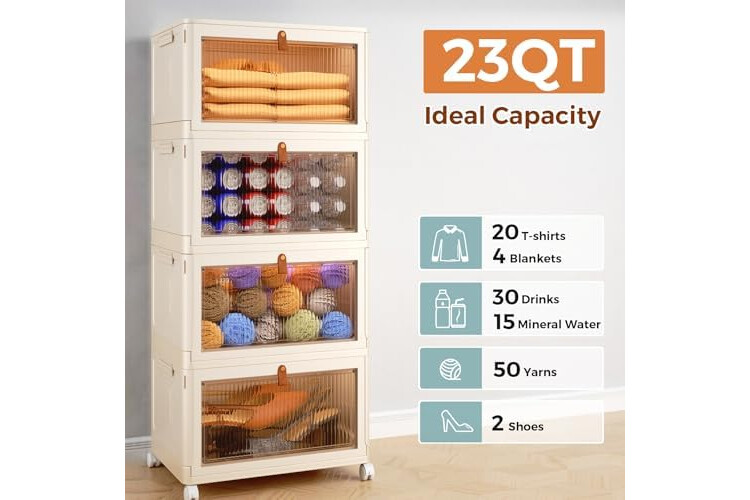 Large Capacity & Upgraded Material - The storage bins measure 14.76 x 11 x 8.27 inches(23 QT capacity) on each floor, and the 4-layer stacked as a whole measures 15.35 x 11 x 32.68 in (height included wheels), with a total capacity of 92 QT. Our storage containers with lids are made of high-quality PP materials for long service life